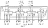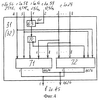 Управляющими входами являются: первым – сигнальный вход /25 Гц/ ключа 69, вторым – управляющий вход /12,5 Гц/ ключа 69, третьим – объединенные третьи управляющие входы /4,5 МГц/ блоков 71, 72, четвертым – объединенные вторые управляющие входы /27 МГц/ блоков 71, 72. Первый управляющий вход накопителя 71 кодов нечетного кадра подключен к первому выходу триггера 70, первый управляющий вход накопителя 72 кодов четного кадра подключен к второму выходу триггера 70. Выходы блоков 71, 72 поразрядно соответствующим образом объединены и являются 1-4624 выходами /578×8/ каждого накопителя 31, 32 /37, 38, 43, 44/ кодов. Накопитель 71 кодов нечетного кадра и накопитель 72 кодов четного кадра идентичны /фиг.5/, каждый включает блоков 731-289 регистров по числу половины активных строк кадра /до удвоения строк/, т.к. каждый блок 73 регистров накапливает коды двух строк. Информационным входом блока 71 /72/ являются поразрядно объединенные 1-8 входы блоков 731-289 регистров, подключенные к выходам 1-8 блока 29 /30/. Первым управляющим входом является первый управляющий вход /25 Гц/ первого блока 731 регистров, вторым – объединенные третьи управляющие входы /27 МГц Uд/ блоков 731-289 регистров, третьим – объединенные вторые управляющие входы /4,5 МГц Uвыд/ блоков 731-289 регистров. Каждый первый управляющий выход предыдущего блока 73 регистров является первым управляющим входом для последующего блока 732-289 регистров. Первый управляющий выход блока 73289 регистров подключен параллельно к четвертым управляющим входам всех блоков 73 регистров. Выходами блоков 71, 72 являются 1-4624 выходы блоков 731-289 регистров /578×8/. Блок 71 производит накопление нечетных кадров, блок 72 производит накопление кодов четных кадров. Блоки 731-289 регистров идентичны /фиг.6, 7/, каждый включает с первого по пятый 74-78 ключи, с первого по четвертый 79-82 распределители импульсов, первые восемь регистров 831-8, последовательно соединенные первый счетчик 84 импульсов и первый дешифратор 85, вторые восемь регистров 861-8, последовательно соединенные второй счетчик 87 импульсов и второй дешифратор 88. Информационным входом блока 73 являются поразрядно объединенные четвертые /информационные/ входы разрядов первых восьми регистров 83 и вторых восьми регистров 86. Выходы разрядов каждого регистра 83, 86 объединены, выходы первых восьми регистров 83 являются первыми 1-8 выходами блока 73, выходы вторых восьми регистров 86 являются вторыми 1-8 выходами блока 73. Управляющих входов четыре: первый – первый управляющий вход первого ключа 74, подключенный к соответствующему выходу триггера 70, второй – объединенные сигнальные входы первого и третьего 74, 76 ключей /27 МГц Uд), третий – объединенные сигнальные входы второго 75 и четвертого 77 ключей /4,5 МГц Uвыд/, четвертый – первый управляющий вход второго ключа, подключенный через диод к первому управляющему выходу последнего блока регистров 73289. Последний выход /1440-й/ распределителя 79 импульсов подключен к второму управляющему входу первого ключа 74 и к первому управляющему входу третьего ключа 76, последний выход /1440/ распределителя 80 импульсов подключен параллельно к счетному входу первого счетчика 84 импульсов, к первым управляющим входам четвертого 77 и пятого 78 ключей и через диод к второму управляющему входу второго ключа 75. Выход первого дешифратора 85 подключен параллельно к третьим управляющим входам разрядов первых восьми регис
