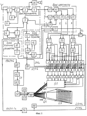 Цифровой телевизор включает /фиг.1/ блок радиоканала из последовательно соединенных селектора 1 каналов, усилителя 2 промежуточной частоты, видеодетектора 3, эмиттерного повторителя 4, селектора 6 синхроимпульсов, блока 6 автоматической подстройки частоты и фазы задающего генератора 7 строчной развертки, блока 8 автоматической подстройки частоты гетеродина и блока 9 автоматической регулировки усиления /АРУ/, блок строчной развертки из последовательно соединенных предварительного усилителя 10, вход которого подключен к выходу задающего генератора 7 строчной развертки, и выходного каскада 11, блок кадровой развертки из последовательно соединенных задающего генератора 12 кадровой развертки, предварительного усилителя 13, выходного каскада 14, генератора 15 импульсов гашения и генератора 16 импульсов обратного хода, блок цветности из последовательно соединенных канала 17 яркости и матрицы 18, три выхода которой подключены к входам выходных видеоусилителей 19, 20, 21, последовательно соединенных усилителя 22 сигналов цветности и блока 23 детекторов сигналов цветности, блока 24 цветовой синхронизации и усилителя 25 импульсов гашения, канал 26 звукового сопровождения, три идентичных канала управления лучом цветности. Первый канал включает последовательно соединенные АЦП 27, первый блок 28 элементов задержек, блок 29 удвоения строк, первый накопитель 31 кодов и первый блок 45 импульсных усилителей, и последовательно соединенные второй блок 30 элементов задержек, второй накопитель 32 кодов и второй блок 46 импульсных усилителей, второй канал включает последовательно соединенные АЦП 33, первый блок 34 элементов задержек, блок 36 удвоения строк, третий накопитель 37 кодов и третий блок 47 импульсных усилителей, второй блок 36 элементов задержек, четвертый накопитель 38 кодов и четвертый блок 48 импульсных усилителей, третий канал включает последовательно соединенные АЦП 39, первый блок 40 элементов задержек, блок 41 удвоения строк, пятый накопитель 43 кодов и пятый блок 49 импульсных усилителей, и последовательно соединенные второй блок 42 элементов задержек, шестой накопитель 44 кодов и шестой блок 50 импульсных усилителей. Цифровой телевизор включает блок 51 яркостной модуляции, усилитель 52 и пьезодефлектор 53 с отражателем на торце, источник 54 положительного опорного напряжения, источник 55 отрицательного опорного напряжения, последовательно соединенные генератор 56 импульсов и ключ 57, первый делитель 58 частоты /6:1/, второй делитель 59 частоты /2:1/, третий делитель частоты 60 /10:1/, блок 61 многократной развертки строк из последовательно соединенных задающего генератора 62 и выходного каскада 63, и включает проекционный объектив 64 и матовый экран 65.