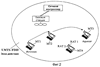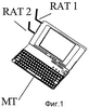 На фиг.1 изображен двухрежимный абонентский терминал МТ, который может иметь доступ к двум системам радиосвязи с разной техникой радиодоступа, например к специальной системе радиосвязи в виде так называемой беспроводной локальной сети WLAN, такой, например, как система стандарта Hyperlan/2 или IEEE802.11, и системе сотовой радиосвязи, например, стандарта GSM (Глобальная система мобильной связи) или стандарта UMTS (Универсальная система мобильной связи), например система UMTS/FDD (дуплексная система с частотным уплотнением). Абонентский терминал МТ содержит для этого первое устройство RAT1 для доступа к специальной системе радиосвязи и второе устройство RAT2 для доступа к системе сотовой радиосвязи. Таким образом, абонентский терминал через два различных радиоинтерфейса может иметь доступ к двум различным системам радиосвязи.