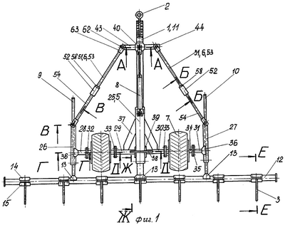 На обрабатываемом массиве механизатор ручки 67 блокираторов 67 приводит в рабочее положение (см. фиг.14). Включает рабочую передачу трактора и одновременно подает масло под давлением в бесштоковую полость силового гидроцилиндра 8. Дополнительная рама 5 относительно прицепного устройства 2 смещается назад по несущей продольной балке. Втулки 55 на полых элементах 53 достигают донных частей стакана 56. Растяжки 51 соединяют жестко концы балок 43 и 44 на кронштейне 40 с передними концами полых балок 26, 27. Дополнительная рама 5 на опорных элементах 7 занимает рабочее положение. Тяговое сопротивление трактора через прицепное устройство 2 и продольную несущую балку 11 передается на поперечный силовой брус 12. От силового бруса 12 усилие через поры кронштейнов 14 и 15 передается на ось 19, а от нее – через втулку 20 на стойку 3.