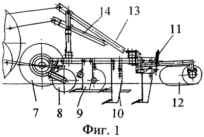 Навесное устройство 6 содержит присоединительные элементы 13 к тракторам тягового класса 5 и 14 для агрегатирования центральной секции орудия с тракторами класса 3.