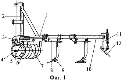 Задачей данного изобретения является упрощение конструкции орудия и его регулировок за счет устранения колес и регулирования только тех рабочих органов, которые должны изменять технологические параметры работы (заглубление).