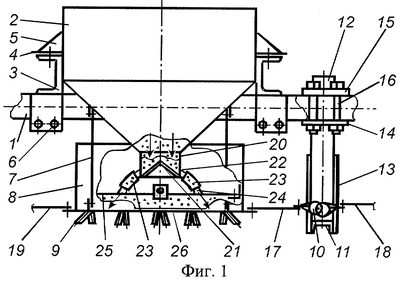 Высевающий аппарат сеялки выполнен вибрационным и содержит раму 1 (фиг.1), на которой закреплен бункер 2 посредством кронштейна 3, для чего к бункеру приварены пластины 4, усиленные косынками 5. Крепление бункера 2 к кронштейну 3 и кронштейна к раме 1 осуществляется болтовыми соединениями 6. К бункеру 2 снизу через гибкие подвески 7 присоединяется высевающее устройство 8 прямоугольной формы с наконечниками семяпроводов 9. Привод 10 высевающего устройства смонтирован на горизонтальной полке 11, приваренной к вертикальному кронштейну 12 и усиленной косынками 13. Кронштейн 12 привода 10 закреплен на раме 1 посредством верхней 15 и нижней 14 накладок, приваренных к кронштейну болтовым соединением 16. Передача колебаний от привода 10 к левому высевающему аппарату 8 и правому (ввиду симметричности правый аппарат не показан) осуществляется посредством шатунов 17 и 18, а от левого к последующим – шатуном 19. Колебания всех левых и правых высевающих аппаратов выполняется в противофазе. К противоположным стенкам нижней горловины 20 бункера 2, примыкающих к скатам козырька 21, прикреплены наконечники 22, к которым присоединены резиновые шланги 23. Вторые концы шлангов закреплены в трубках 24, которые установлены в перегородке 25, расположенной над дном и параллельно дну 26 корпуса высевающего устройстве 8. Перегородка 25 (фиг.2) крепится к боковым и торцевым 27 стенкам корпуса высевающего устройства 8 с помощью уголков 28. Уголки 28 присоединены к стенкам корпуса высевающего устройства, в том числе и к торцевой стенке 27, винтами 29.