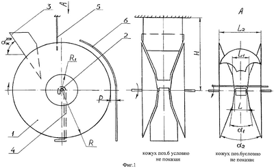 Расстояние р от точек наибольшего диаметра конических дисков 1 по радиусу от оси вращения до поверхности кожуха 6 определяется из условия: