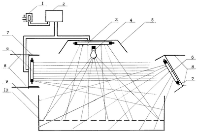 Эта цель достигается тем, что молодняк свиней облучается устройством для облучения сельскохозяйственных животных (чертеж), представляющим собой систему включения в сеть (1), подающую напряжение в реле времени 2 РВМ (2), работающее в двух режимах, из которых первый подает напряжение в облучатель ИКУФ с источниками лучистой энергии БУВ-15 (3), инфракрасной лампы (4), отражателя ламп БУВ-15 (3) и инфракрасной лампы (5), второй – в бактерицидную лампу БУВ-30 (6), которые соединены параллельно. Угол поворота ламп БУВ-30 регулируется посредством специальных приспособлений (8).