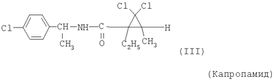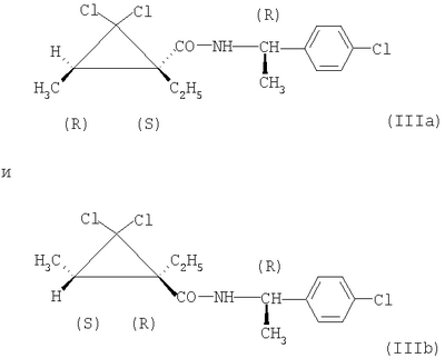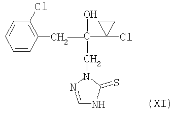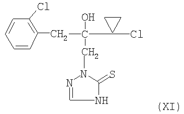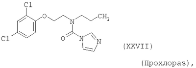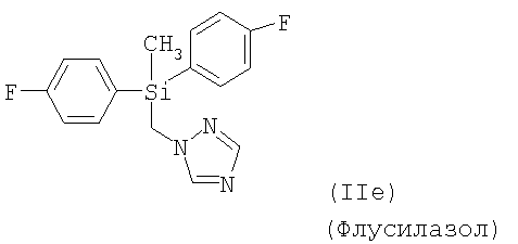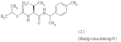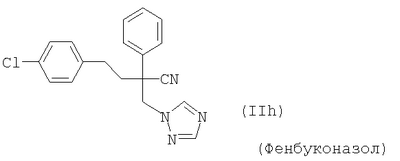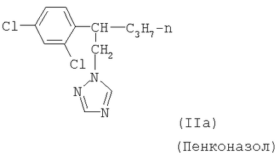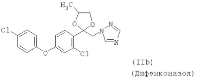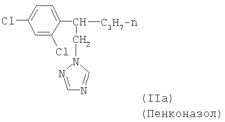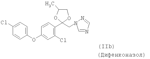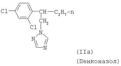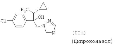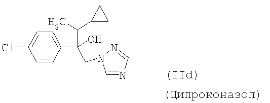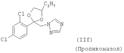 и/или (18) дикарбоксимида формулы a) и/или b) и/или (19) метоксиакрилатного производного формулы и/или (20) производного хинолина формулы и/или (21) производного фениламида формулы и/или (22) фосфористой кислоты формулы и их переносимых растениями солей, например таких, как соли алюминия, и/или (23) производного пиррола формулы a) и/или b) и/или (24) фенилкарбамата формулы и/или (25) например, гидроксида меди (I) и гидроксида меди (II), особенно гидроксида меди (II), и/или (26) производного имидазола формулы обладают очень хорошими фунгицидными свойствами. Поразительным образом фунгицидная активность заявляемых комбинаций биологически активных соединений существенно выше, чем сумма активностей отдельных биологически активных соединений. Это есть, таким образом, неожидаемый, чистый синергический эффект, а не только дополнительная активность. Из структурной формулы биологически активного вещества формулы (I) видно, что оно содержит два асимметрически замещенных атомов углерода. Поэтому продукт может находиться в форме смеси различных изомеров или в виде отдельного изомера. Предпочтительными являются соединения (I-а), в которых аминокислотная часть образуется из изопропоксикарбонил-L-валина и фенилэтиламинная часть имеет R(+)-конфигурацию. Из структурной формулы биологически активного вещества формулы (III) видно, что оно содержит три асимметрически замещенных атомов углерода. Поэтому продукт может находиться в виде смеси различных изомеров или также в форме отдельных компонент. Особенно предпочтительными являются соединения Гидроксиэтильное производное триазола формулы (XI) может находиться в “тионо”-форме формулы