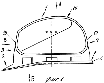 Передняя, задняя и боковые части 3, 7 и 8 корпуса во фронтальных проекциях корпуса на виде сбоку (фиг.1) и на виде спереди (фиг.4), на участках между поясом 5 жесткости и куполообразной верхней частью 10 имеют наклонные прямолинейные переднюю стенку 18, заднюю стенку 19 и боковые стенки 20, соединенные скругленными линиями перехода (которые на фиг.1 и 4 не показаны) с наклонной стенкой 17 дополнительного пояса 15 жесткости. В поперечном сечении дополнительный и основной пояса 15 и 5 жесткости в совокупности (фиг.6) имеют -образную форму. При этом наклонные прямолинейные стенки 18,19 и 20 корпуса расположены под углом =7÷13° к вертикали.