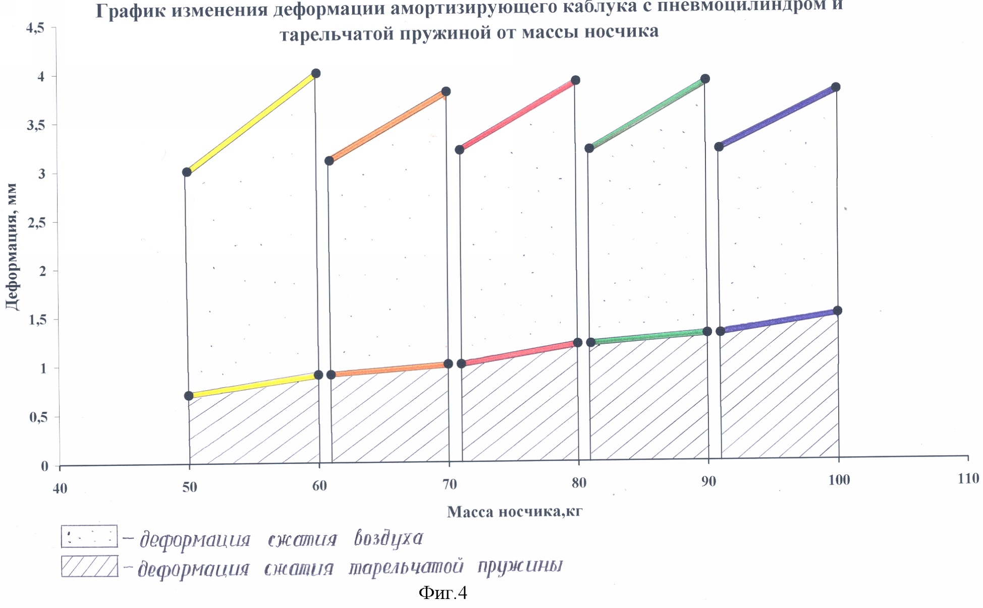 На фиг.4 диаграмма работы амортизирующего каблука: зависимость величины деформации от массы носчика.