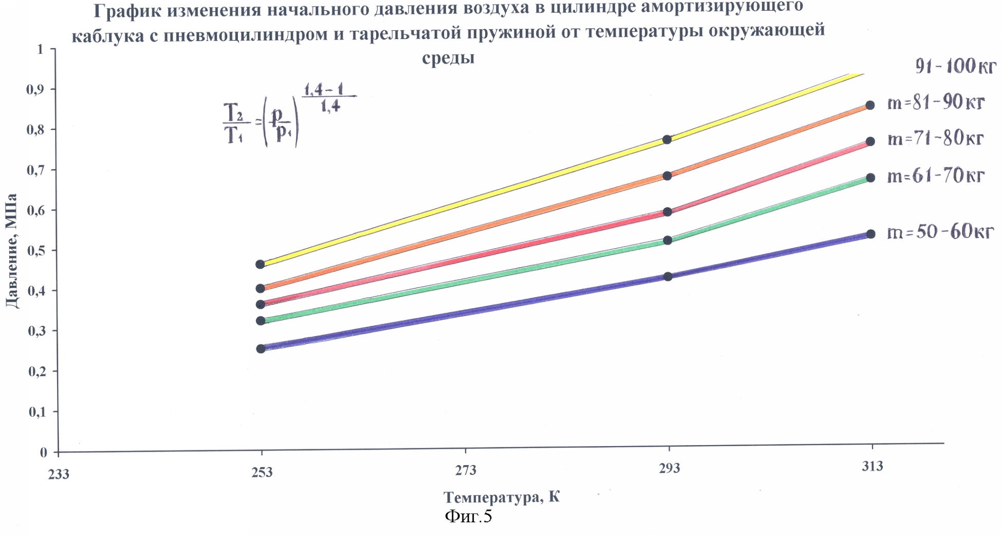Использовав уравнение состояния идеального газа при адиабатическом процессе рассчитываем изменение начального давления p1, при перепаде температур от -20°С до +40°С (фиг.5):