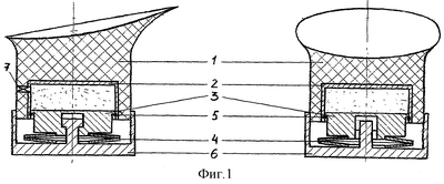 На фиг.1 представлена амортизирующего каблука с пневмоцилиндром и тарельчатой пружиной: 1 – каблук; 2- пневмоцилиндр; 3 – поршень; 4 – тарельчатая пружина; 5 – стопорное кольцо; 6 – подвижная набойка; 7 – вентиль для подкачивания газа.