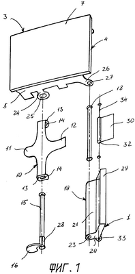 Боковые стенки 5 корпуса 4 имеют ушки 24 с отверстиями 25, в которых установлена первая ось шарнира 15 с возможностью ее поворота при взаимодействии с ручкой 16, а также имеют выступы 26 с отверстиями 27 для крепления второй оси шарнира 18.