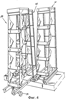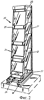 На фиг.4 изображены три каркаса 20, 40, 41, средний 20 из которых выдвинут из своего нормального положения. При нахождении в этом выдвинутом положении опора 26 каркаса 20 (описанная ранее со ссылкой на фиг.2) откинута вниз к полу. Два остальных каркаса 40, 41, расположенные по обеим сторонам, показаны в своем нормальном положении с поднятыми опорами. Кроме того, на чертеже показано, что опоры снабжены колесами, которые перемещаются как по возвышению, так и по полу торгового помещения.