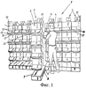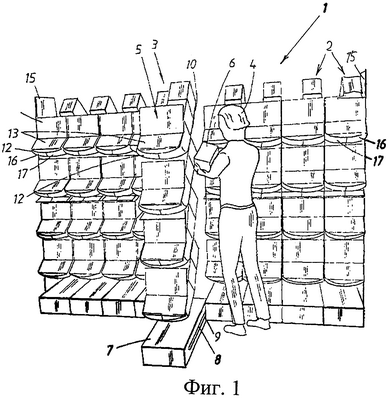 На фиг.1 изображена торговая секция 1, составленная из отдельных торговых блоков 2, установленных бок о бок вдоль стены в торговом помещении. На чертеже также показан торговый блок 3, выдвинутый из торговой секции. Рядом с выдвинутым торговым блоком 3 изображен человек 4, собирающийся пополнить товаром контейнеры 5, расположенные в этом торговом блоке. Выполняя это, указанный человек 4 открывает пополняющую упаковку 6, чтобы засыпать новый товар в повернутый наружу пополняющий контейнер (не показан), затем товар попадает вниз в соответствующий контейнер и после этого пополняющий контейнер снова поворачивают назад, возвращая его в нормальное положение. После выполнения процедуры пополнения выдвинутый блок снова перемещают в нормальное положение в торговой секции. Кроме того, из чертежа можно видеть, что торговая секция имеет нижнюю часть 7, содержащую средства 8 перемещения, выполненные в виде направляющих планок, которые с одной стороны присоединены к этой нижней части 7, а с другой стороны – к прикрепленному к полу элементу 9. К этому элементу 9 присоединен также смежный торговый блок.