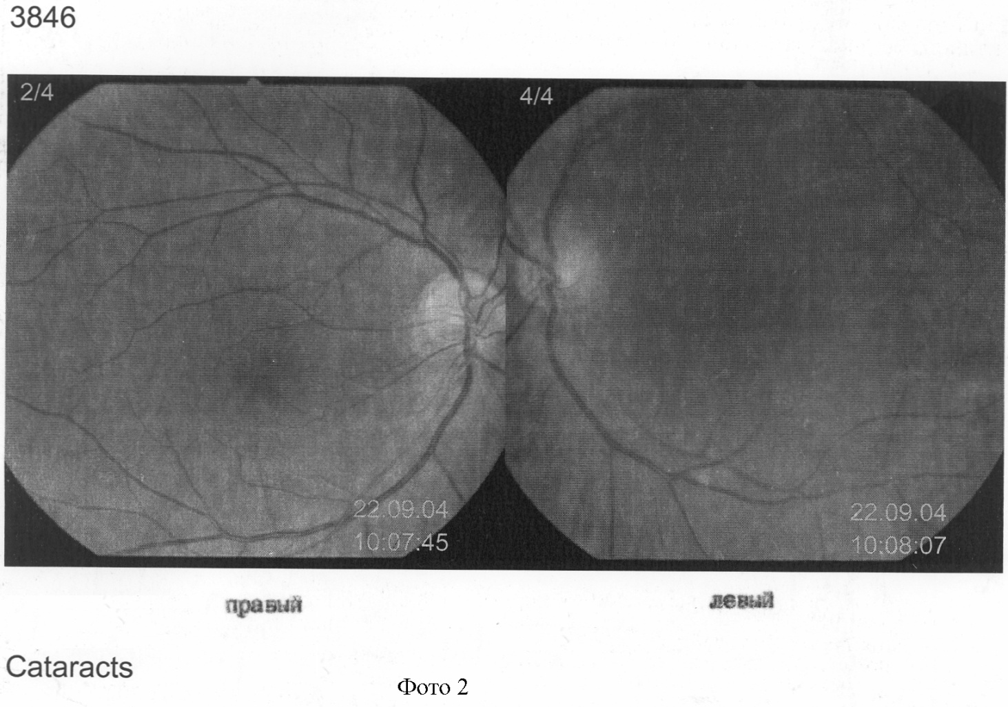 На фотографии 3 затемнение на фоне сетчатки составляет 9%. Диагноз – начальная стадия развития катаракты правого глаза, левый – здоров.