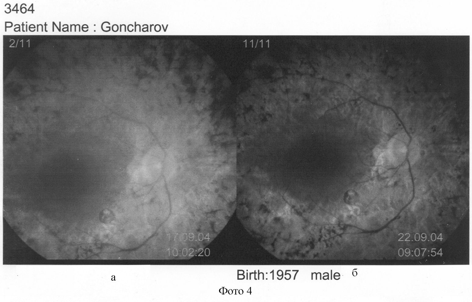 На фотографии 4 затемнение составляет 8%. Диагноз – начальная стадия катаракты правого глаза («а»), «б» – тот же глаз после операции, затемнения нет.