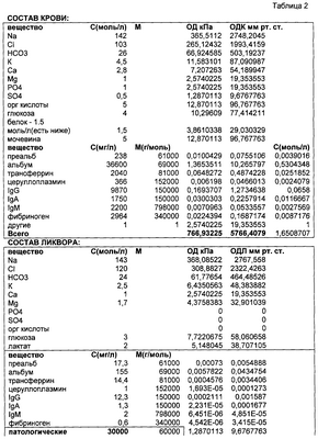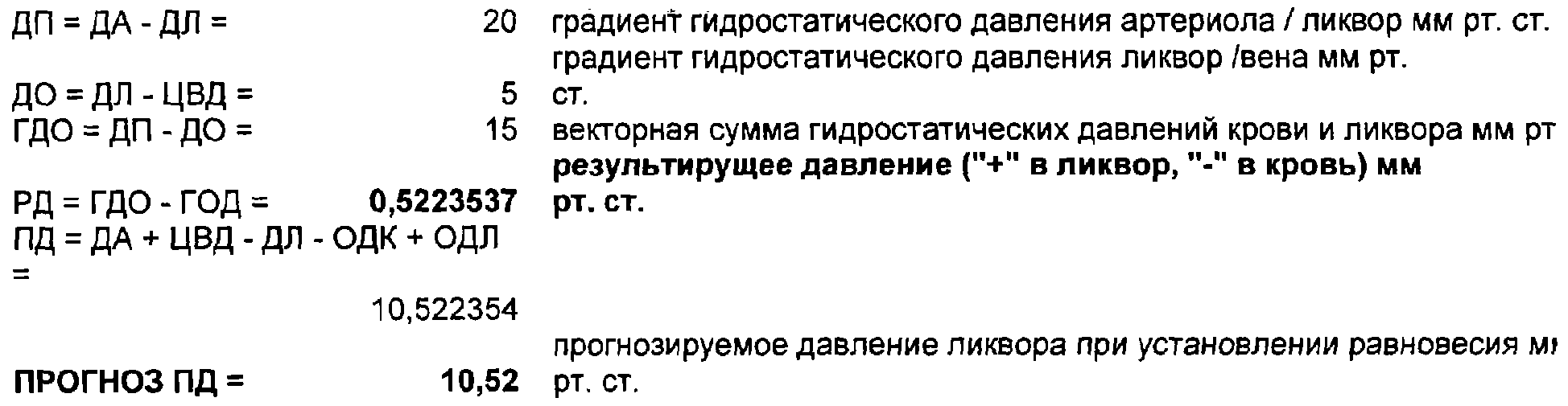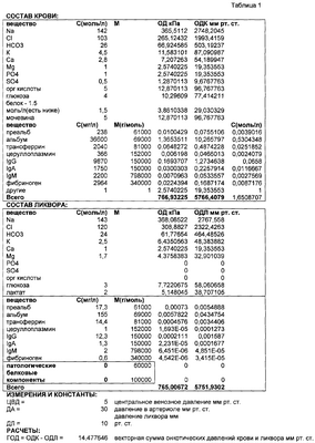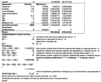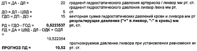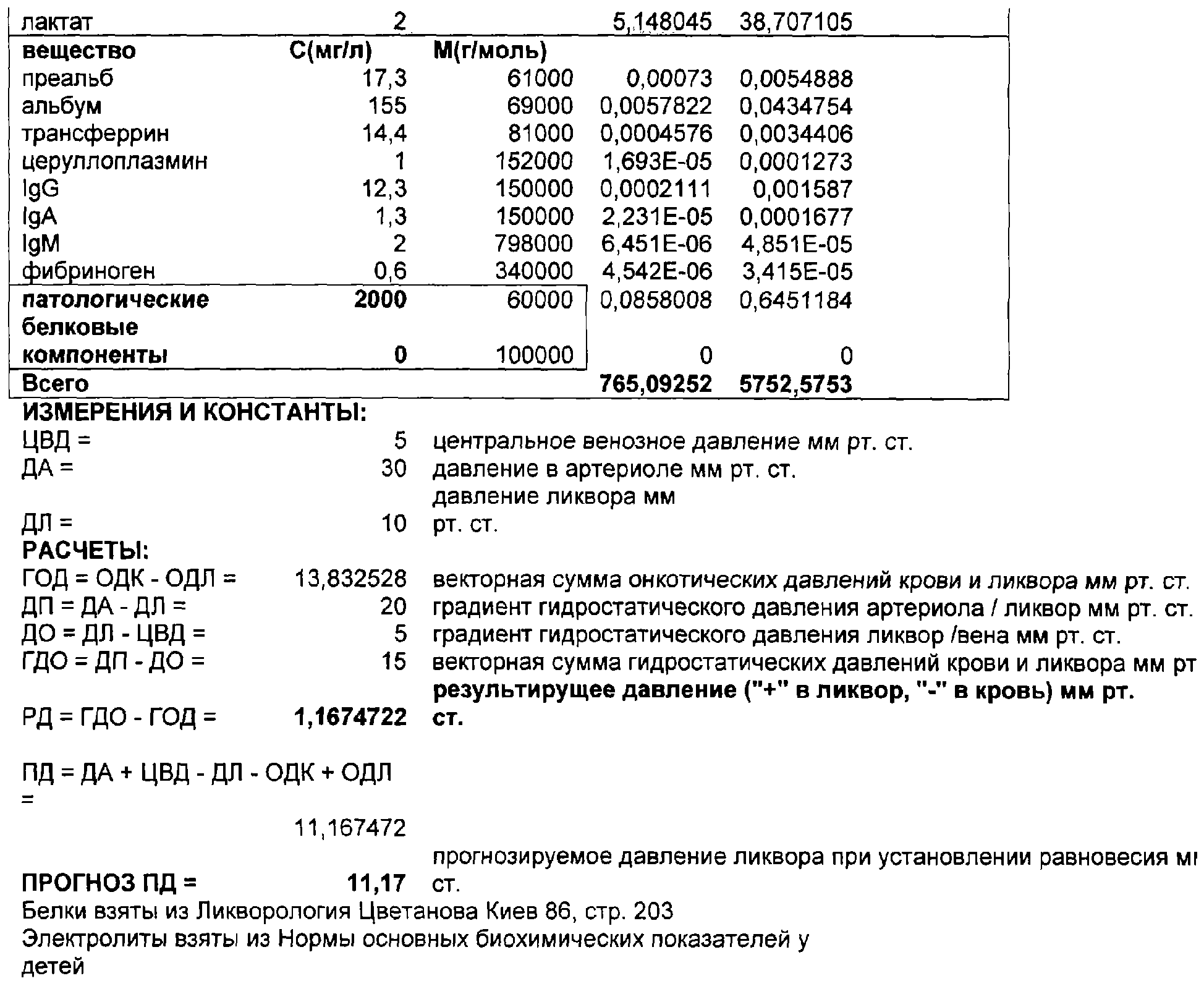 ОДЛ – общее осмотическое давление ликвора (мм рт.ст.). ОДК – общее осмотическое давление крови (мм рт.ст.). Векторная сумма (градиент) осмотического давления (ГОД): ГОД=ОДК-ОДЛ, т.к. векторы разнонаправлены. Градиент осмотического давления в норме положителен и направлен на отток жидкости из ликвора. Гидростатическое давление на приток из артериол в ликвор (ДП мм рт.ст.) ДП=ДА-ДЛ, где ДА – давление в артериоле (30 мм рт.ст.), ДЛ – гидростатическое давление ликвора (в норме около 10 мм рт.ст.). Гидростатическое давление на отток из ликвора в вены ДО (мм рт.ст.) вычисляют по формуле: ДО=ДЛ-ЦВД, где ЦВД – центральное венозное давление (мм рт.ст.). Векторная сумма гидростатического давления (ГДО): ГДО=(ДА-ДЛ)-(ДЛ-ЦВД)=ДА+ЦВД-2*ДЛ (мм рт.ст.), т.к. векторы разнонаправлены. Векторная сумма гидростатического давления в норме положительна и направлена на приток жидкости в ликвор. При повышении ДЛ ГДО уменьшается (изменяется в пользу оттока). Результирующее давление (РД, мм рт.ст.) РД=ГДО-ГОД (мм рт.ст.). В состоянии равновесия РД=0. Если РД>0, система находится в неравновесном состоянии, в системе будет преобладать приток до тех пор, пока за счет ДЛ не компенсируется разность давлений. Таким образом, прогнозируемое давление ликвора в желудочках (ПД) после установления равновесия: ПД=ДЛ+РД. Таким образом, ПД=ДЛ+ДА+ЦВД-2*ДЛ-ГОД, ПД=ДА+ЦВД-ДЛ-ОДК+ОДЛ, ДА – давление в артериоле (30 мм рт.ст.), ЦВД – центральное венозное давление (мм рт.ст.), ДЛ – гидростатическое давление ликвора, ОДЛ – общее осмотическое давление ликвора (мм рт.ст.), ОДК – общее осмотическое давление крови (мм рт.ст.). Результирующее давление, как прогноз динамики системы: РД=ПД-ДЛ, и при РД=0 динамику давления не прогнозируют, при РД>0 прогнозируют повышение интравентрикулярного давления, при РД<0 прогнозируют снижение интравентрикулярного давления. На таблице 1 представлено взаимоотношение между системой ликвора и крови в норме. При патологических изменениях, приводящих к повышению какого-либо компонента цереброспинальной жидкости, это равновесие нарушается. Предлагаемый способ позволяет оценивать вклад нарушения состава ликвора в патогенез развития интравентрикулярной гипертензии и гидроцефалии, на основании которого возможно прогнозировать их степень. Пример: Больная К, поступила в РАО в возрасте 7 суток с диагнозом «Гипоксически-геморрагическое поражение ЦНС тяжелой степени, ИВК 3 степени». Ребенок от 1 беременности на фоне ХФПН, анемии, от 1 преждевременных родов в срок 33 недели, раннее отхождение околоплодных вод. Масса новорожденного при рождении 1500 г по шкале Апгар 5-6 баллов. Ухудшение состояния ребенка наблюдалось на 5 сутки, стал вялым, перестал сосать, усилилась иктеричность кожных покровов. После консультации по линии РКЦ ребенок переведен в РАО 2 РДКБ. В момент поступления состояние ребенка тяжелое, уровень сознания – глубокое оглушение, на осмотр реакция снижена, определяются плавающие движения глазных яблок, ребенок не сосет, крик тихий, протяжный, тетрапарез, голова гидроцефальной формы, большой родничок напряжен, выражен сосудистый рисунок вен кожных покровов головы. Ребенку выполнено нейросонографическое исследование, где выявлено расширение вентрикулярной системы, ИВК 3 степени (тромб в правом боковом желудочке 47 на 12 мм, в левом 34 на 8 мм, наслаивающийся на сосудистые сплетения, гип