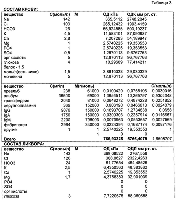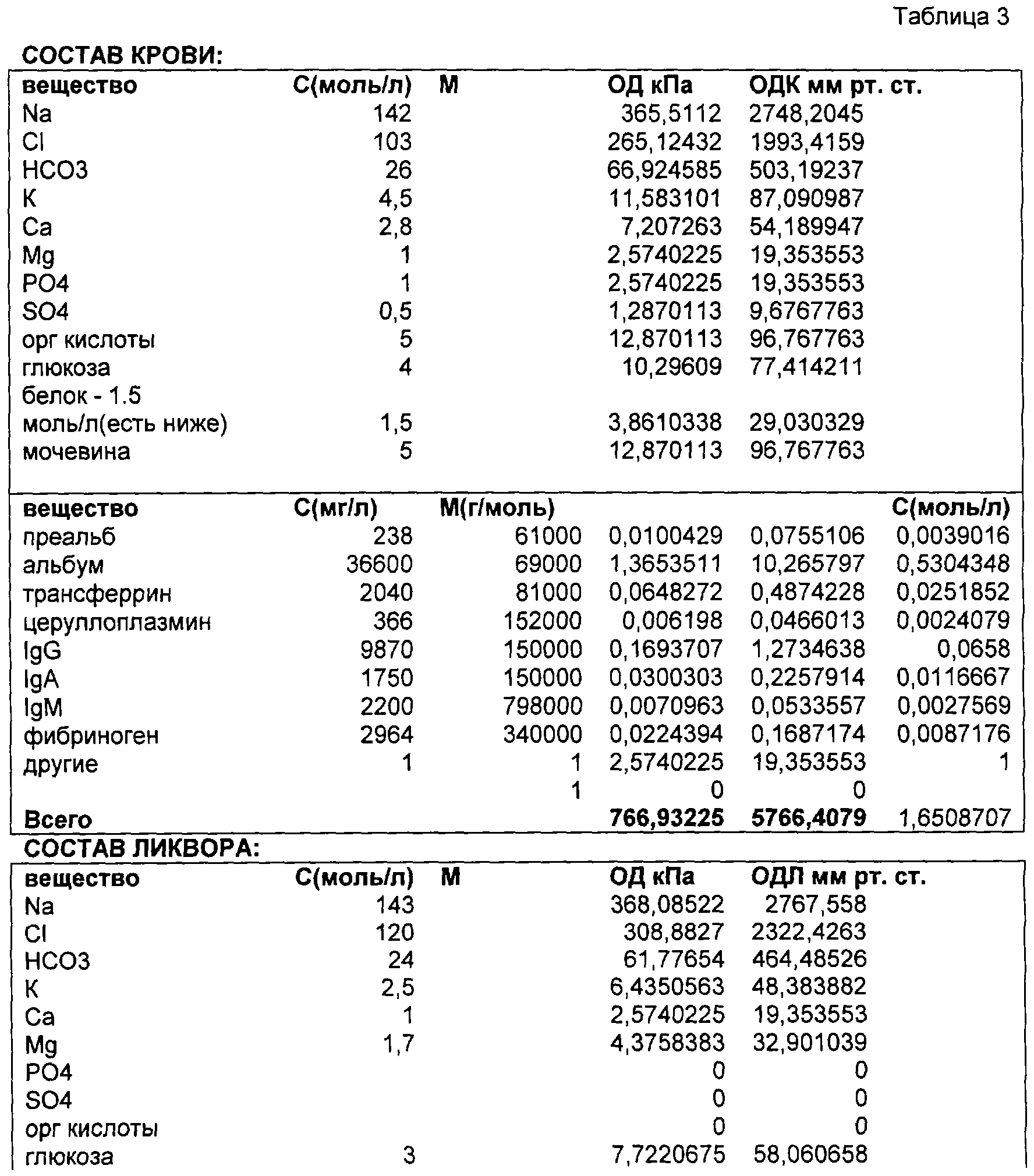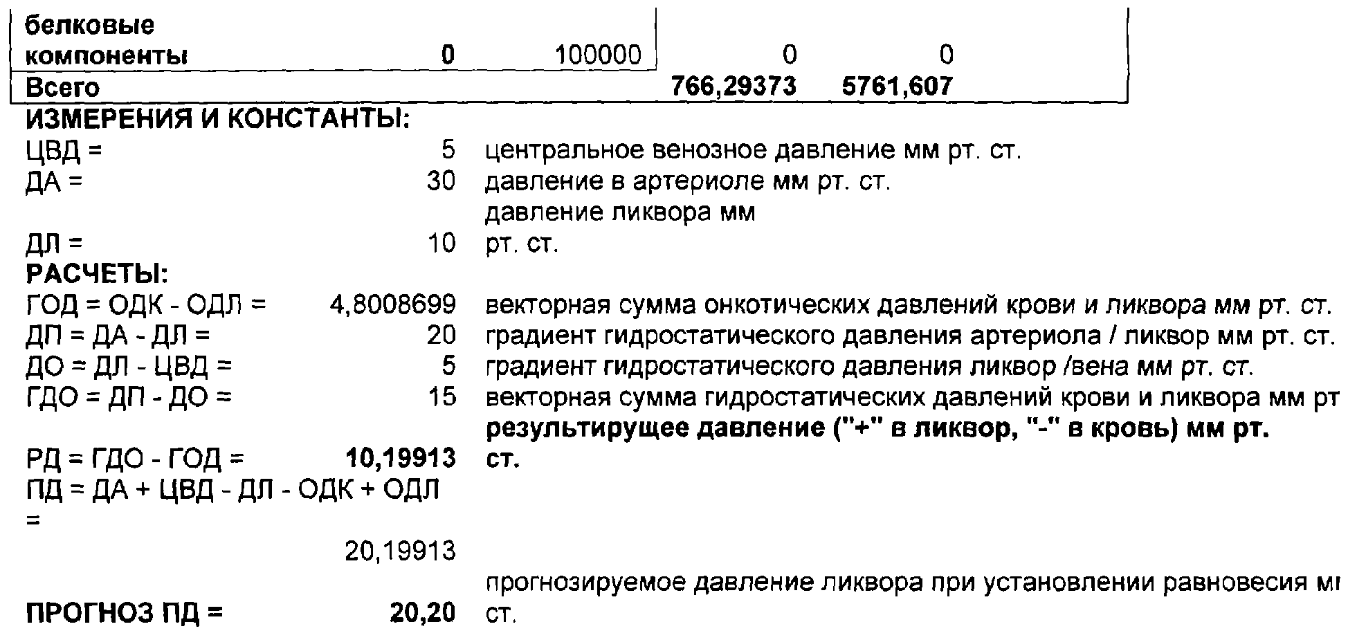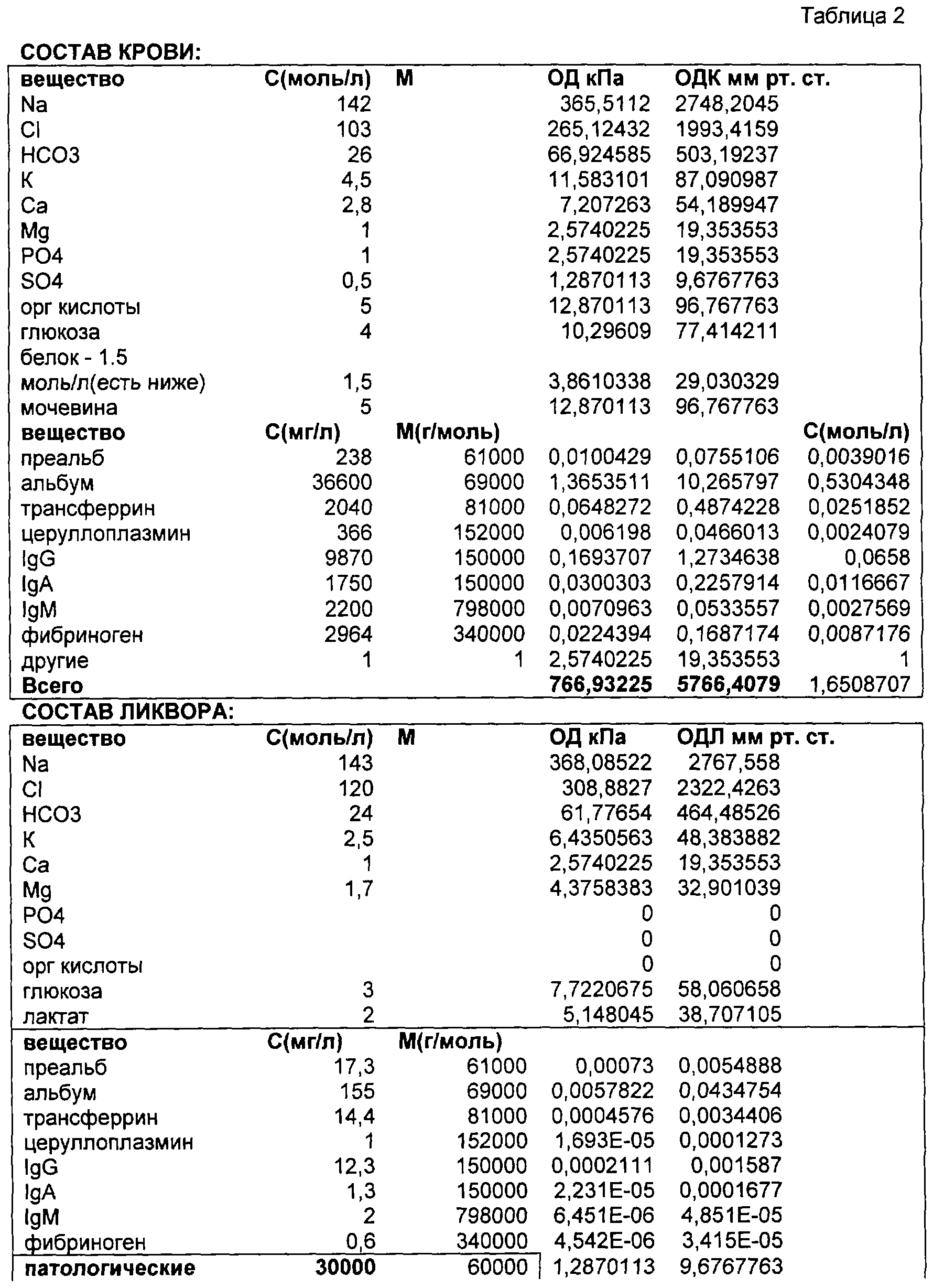 ОДЛ – общее осмотическое давление ликвора (мм рт.ст.). ОДК – общее осмотическое давление крови (мм рт.ст.). Векторная сумма (градиент) осмотического давления (ГОД): ГОД=ОДК-ОДЛ, т.к. векторы разнонаправлены. Градиент осмотического давления в норме положителен и направлен на отток жидкости из ликвора. Гидростатическое давление на приток из артериол в ликвор (ДП мм рт.ст.) ДП=ДА-ДЛ, где ДА – давление в артериоле (30 мм рт.ст.), ДЛ – гидростатическое давление ликвора (в норме около 10 мм рт.ст.). Гидростатическое давление на отток из ликвора в вены ДО (мм рт.ст.) вычисляют по формуле: ДО=ДЛ-ЦВД, где ЦВД – центральное венозное давление (мм рт.ст.). Векторная сумма гидростатического давления (ГДО): ГДО=(ДА-ДЛ)-(ДЛ-ЦВД)=ДА+ЦВД-2*ДЛ (мм рт.ст.), т.к. векторы разнонаправлены. Векторная сумма гидростатического давления в норме положительна и направлена на приток жидкости в ликвор. При повышении ДЛ ГДО уменьшается (изменяется в пользу оттока). Результирующее давление (РД, мм рт.ст.) РД=ГДО-ГОД (мм рт.ст.). В состоянии равновесия РД=0. Если РД>0, система находится в неравновесном состоянии, в системе будет преобладать приток до тех пор, пока за счет ДЛ не компенсируется разность давлений. Таким образом, прогнозируемое давление ликвора в желудочках (ПД) после установления равновесия: ПД=ДЛ+РД. Таким образом, ПД=ДЛ+ДА+ЦВД-2*ДЛ-ГОД, ПД=ДА+ЦВД-ДЛ-ОДК+ОДЛ, ДА – давление в артериоле (30 мм рт.ст.), ЦВД – центральное венозное давление (мм рт.ст.), ДЛ – гидростатическое давление ликвора, ОДЛ – общее осмотическое давление ликвора (мм рт.ст.), ОДК – общее осмотическое давление крови (мм рт.ст.). Результирующее давление, как прогноз динамики системы: РД=ПД-ДЛ, и при РД=0 динамику давления не прогнозируют, при РД>0 прогнозируют повышение интравентрикулярного давления, при РД<0 прогнозируют снижение интравентрикулярного давления. На таблице 1 представлено взаимоотношение между системой ликвора и крови в норме. При патологических изменениях, приводящих к повышению какого-либо компонента цереброспинальной жидкости, это равновесие нарушается. Предлагаемый способ позволяет оценивать вклад нарушения состава ликвора в патогенез развития интравентрикулярной гипертензии и гидроцефалии, на основании которого возможно прогнозировать их степень. Пример: Больная К, поступила в РАО в возрасте 7 суток с диагнозом «Гипоксически-геморрагическое поражение ЦНС тяжелой степени, ИВК 3 степени». Ребенок от 1 беременности на фоне ХФПН, анемии, от 1 преждевременных родов в срок 33 недели, раннее отхождение околоплодных вод. Масса новорожденного при рождении 1500 г по шкале Апгар 5-6 баллов. Ухудшение состояния ребенка наблюдалось на 5 сутки, стал вялым, перестал сосать, усилилась иктеричность кожных покровов. После консультации по линии РКЦ ребенок переведен в РАО 2 РДКБ. В момент поступления состояние ребенка тяжелое, уровень сознания – глубокое оглушение, на осмотр реакция снижена, определяются плавающие движения глазных яблок, ребенок не сосет, крик тихий, протяжный, тетрапарез, голова гидроцефальной формы, большой родничок напряжен, выражен сосудистый рисунок вен кожных покровов головы. Ребенку выполнено нейросонографическое исследование, где выявлено расширение вентрикулярной системы, ИВК 3 степени (тромб в правом боковом желудочке 47 на 12 мм, в левом 34 на 8 мм, наслаивающийся на сосудистые сплетения, гип