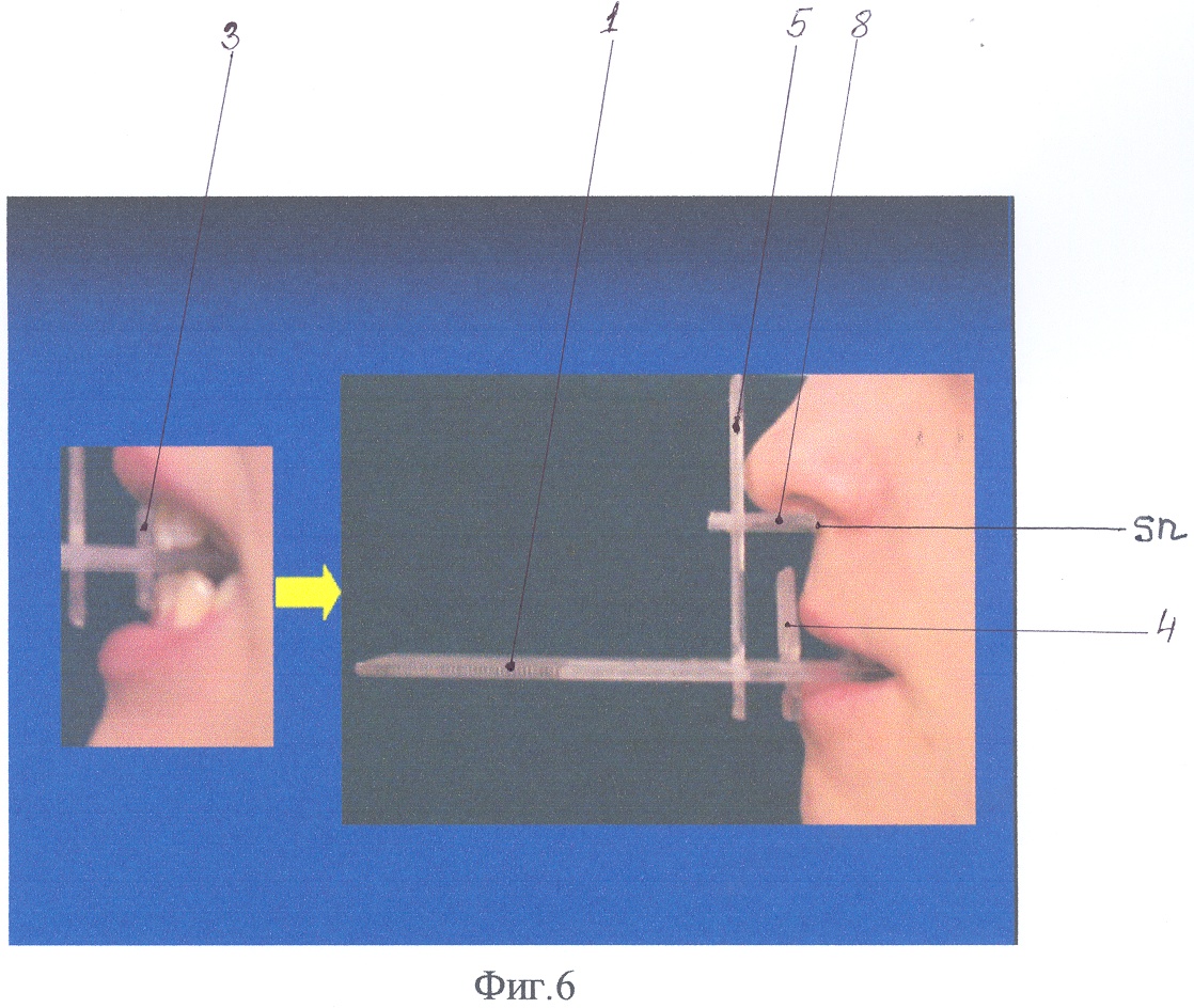 Пациент накусывает горизонтальную линейку 1 так, чтобы вертикальная пластика 3 прилегала к вестибулярной поверхности фронтальных зубов (см. Фиг.6). Вертикальную пластинку 4 по прорези 2 горизонтальной линейки 1 придвигают к области самой выступающей точки на контуре верхней губы пациента. По шкале делений горизонтальной линейки 1 определяют расстояние между вертикальными пластинками 3 и 4. Так устанавливают значение параметра “толщина губы”.