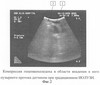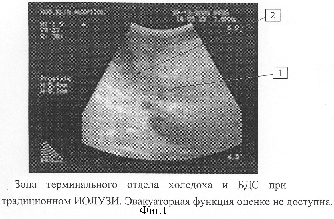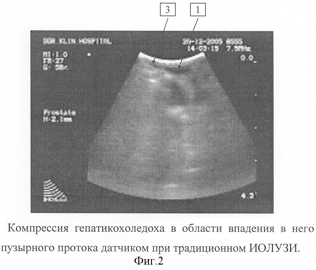 На фигуре 1 представлена зона терминального отдела холедоха и БДС при традиционном ИОЛУЗИ. Цифрой 1 обозначен терминальный отдел холедоха, цифрой 2 – просвет двенадцатиперстной кишки. Эвакуаторная функция оценке не доступна. Существуют сложности правильного измерения размеров протоков из-за их компрессии датчиком даже при небольшом надавливании. На фигуре 2 изображена компрессия гепатикохоледоха датчиком в области впадения в него пузырного протока при традиционном ИОЛУЗИ. Цифрой 1 обозначен просвет холедоха, цифрой 3 – пузырный проток.