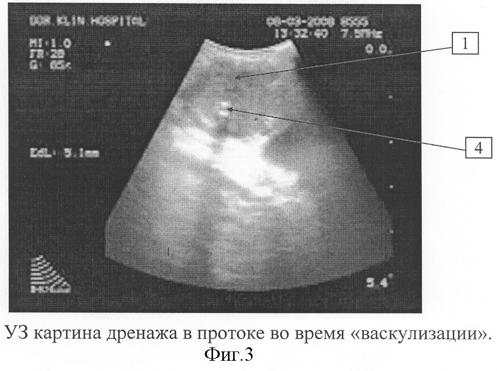 Следующим этапом ИОУЗИ является исследование внепеченочных желчных путей во время создания «васкулизации» протоков с временной дозированной билиарной гипертензией. Выделяется пузырный проток до места впадения в гепатикохоледох. Пузырная артерия до проведения исследования не клипируется и не пересекается. Это предохраняет от соскальзывания клипсы и возникновения кровотечения из пузырной артерии при манипуляции ультразвуковым датчиком, а также излишней деформации гепатодуоденальной связки. На уходящую вместе с желчным пузырем часть пузырного протока накладывается клипса. Производится надсечение пузырного протока до вскрытия 1/3-1/2 диаметра его просвета ниже наложенной клипсы. Ножницы для надсечения пузырного протока целесообразнее вводить через эпигастральный порт. Это создает более благоприятные условия при последующей катетеризации пузырного протока. Через 5 мм троакар, располагающийся в правом подреберье по среднеключичной линии вводится поливиниловый катетер диаметром 6 Fr с торцевым отверстием на дистальном конце. Троакар повторно вводится через этот же порт рядом с катетером. Производится катетеризация пузырного протока. Для этого ассистент за дно желчного пузыря натягивает гепатодуоденальную связку и производится тракция за гартмановский карман латерально. Диссектором, введенным через эпигастральный троакар, захватывается кончик катетера и вводится через пузырный проток в гепатикохоледох с последующим ультразвуковым контролем нахождения дистального конца катетера в 5 мм от места впадения пузырного протока в гепатикохоледох. На фигуре 3 показана ультразвуковая картина дренажа в протоке во время «васкулизации». Цифрой 1 обозначен просвет протока, цифрой 4 – дренаж.