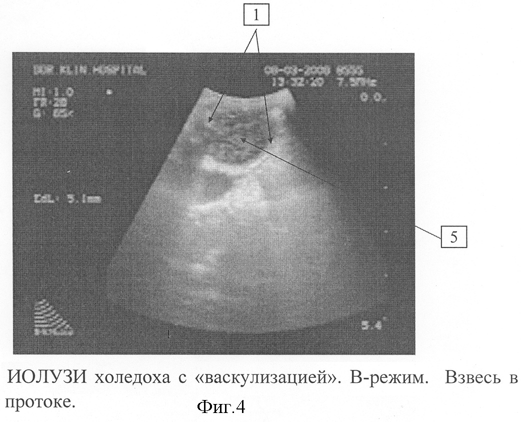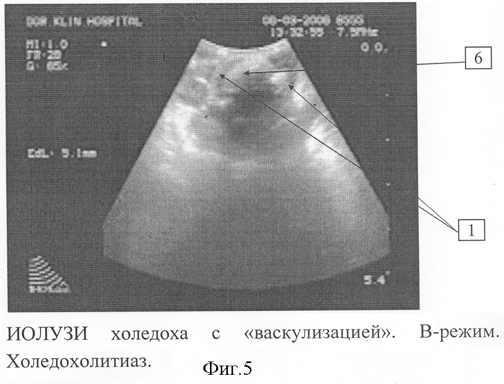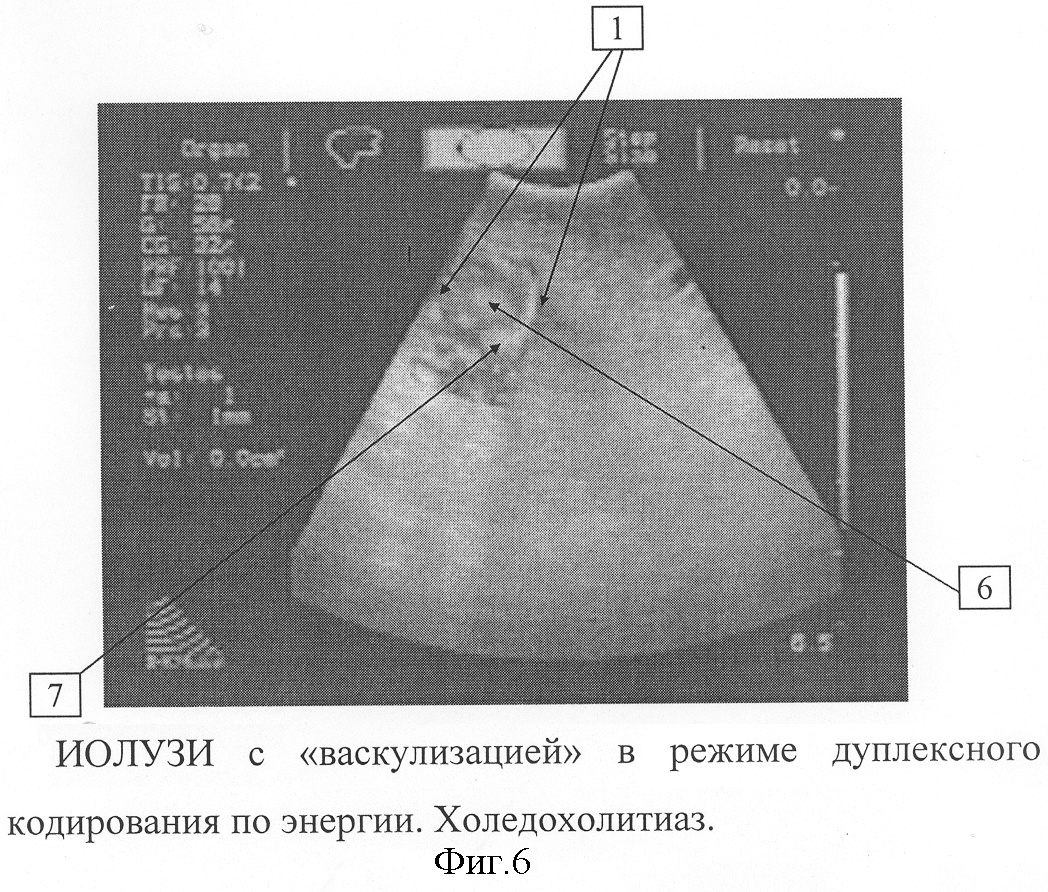 К наружному концу катетера присоединяется шприц Жане с физиологическим раствором, соединенный с водяным манометром. В пузырном протоке катетер фиксируется клипированием до отсутствия движения катетера в пузырном протоке при сохранении прохождения жидкости по просвету. Через эпигастральный троакар вводится ультразвуковой лапароскопический датчик, рабочая часть которого устанавливается в области ворот печени. Моделируется васкулизация желчных протоков при создании временной гипертензии в них путем нагнетания жидкости шприцом Жане под давлением 350-550 мм водного столба. Одновременно производится ультразвуковое исследование в В-режиме и режиме дуплексного энергетического сканирования. Не отрывая датчик, перемещают его в дистальном по ходу гепатикохоледоха направлении, продолжая введение жидкости. На уровне общего печеночного протока, супрадуоденальной части общего желчного протока, панкреатической части общего желчного протока измеряется диаметр протока, толщина его стенок, выявляются внутрипросветные образования. На фигуре 4 показано ИОЛУЗИ холедоха с «васкулизацией» в В-режиме. Цифрой 5 обозначена взвесь в протоке, цифрой 1 – границы протока. На фигуре 5 показаны ультразвуковые признаки холедохолитиаза при ИОЛУЗИ с «васкулизацией» в В-режиме. Цифрой 6 обозначен конкремент, цифрой 1 – границы протока. Оценка истинных размеров конкрементов более достоверна в режиме цветового кодирования по энергии – область препятствия не заполняется цветом – эффект «обрыва» цветовой картограммы представлен на фигуре 6. Цифрой 6 обозначен конкремент, цифрой 1 – границы протока, цифрой 7 – заполнение цветом просвета протока, отражающее движущуюся по нему жидкость.