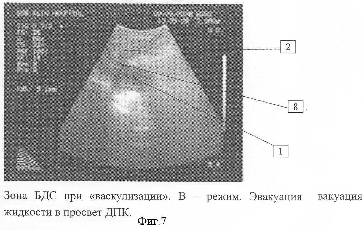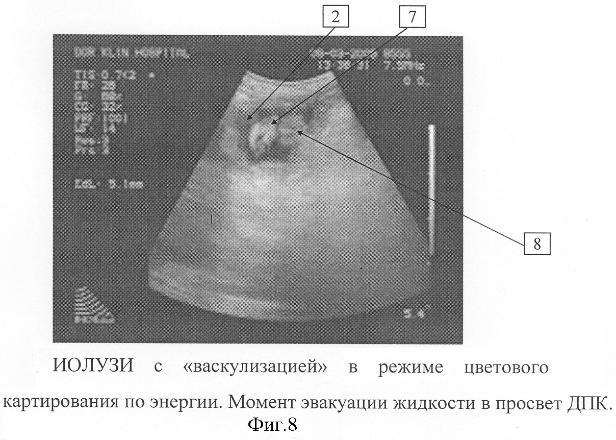 После чего включается режим дуплексного энергетического сканирования. При этом вышеперечисленные образования (при условии сохранения в них проходимости) выделяются одним цветом на фоне обычного изображения в В-режиме. Регистрируется факт наличия тока жидкости через Фатеров сосок в двенадцатиперстную кишку и в двенадцатиперстной кишке. На фигуре 8 показан момент эвакуации жидкости в просвет ДПК при ИОЛУЗИ с «васкулизацией» в режиме цветового картирования по энергии. Цифрой 2 обозначен просвет ДПК, цифрой 8 – БДС, цифрой 7 – заполнение цветом просвета ДПК, отражающее поступающую в него через БДС жидкость.