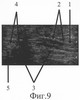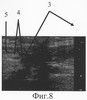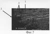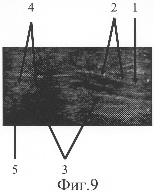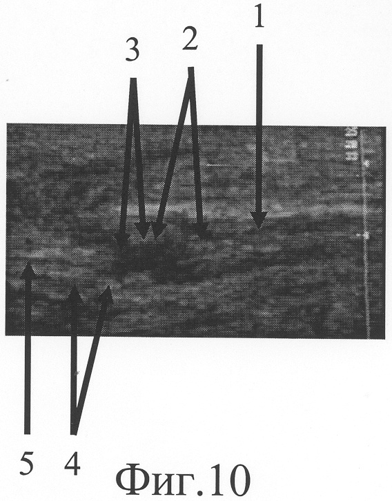 Через 5 недель после начала дистракции на сонограмме (фиг.9) на месте дефекта выявлен регенерат локтевого нерва (фиг.9-1), заканчивающийся невромой, линейный размер которой составляет 4 мм (фиг.9-2), его дистальный фрагмент с патологическими изменениями на протяжении 5 мм (фиг.9-5). Диастаз между невромой и дистальным фрагментом стал равен 15 мм (фиг.9-5). Размер участка локтевого нерва, подлежащего возмещению, сократился до 24 мм. Дозированная дистракция на шине продолжалась.