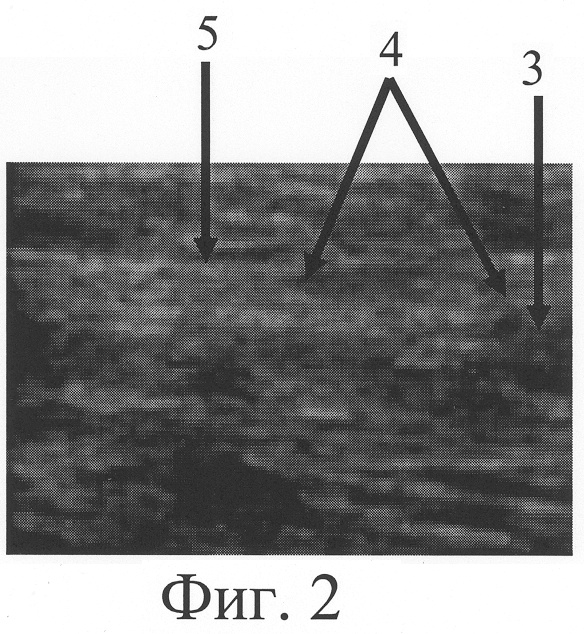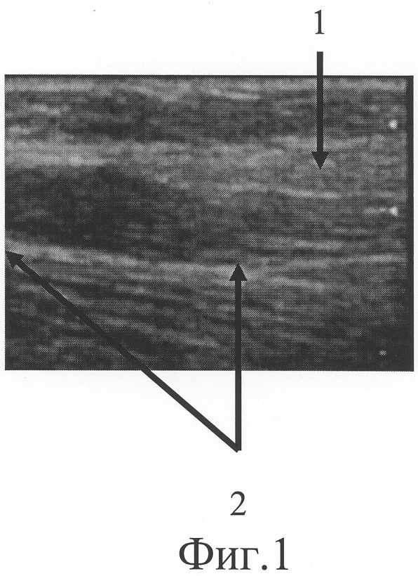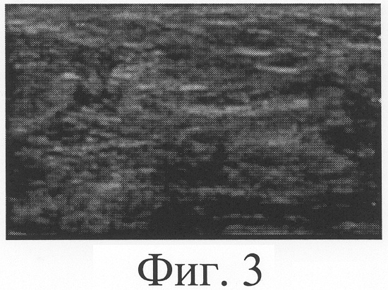На фиг.3 представлена сонограмма больной А., 52 лет, с застарелым повреждением локтевого нерва в средней трети правого предплечья (область дефекта нерва).