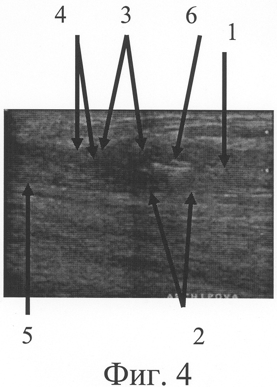 Через 6 недель после начала дистракции на сонограмме (фиг.6) на месте дефекта выявлен регенерат локтевого нерва (фиг.6-1), заканчивающийся невромой (фиг.6-2), линейный размер которой составляет 10 мм, его дистальный фрагмент (фиг.6-5) с патологическими изменениями на протяжении 2 мм (фиг.6-4). Диастаз между невромой и дистальным фрагментом стал равен 4 мм (фиг.6-3). Размер участка локтевого нерва, подлежащего возмещению, сократился до 16 мм. Произведен 3 этап операции, на котором данные ультрасонографии подтвердились и был выполнен эпиневральный шов локтевого нерва.