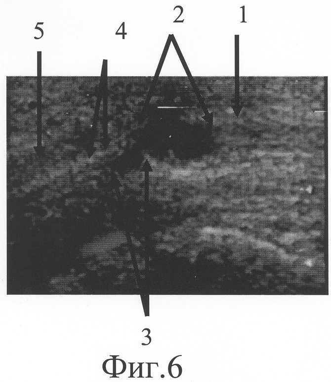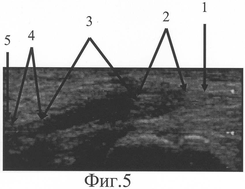 При ультрасонографическом исследовании (фиг.5) установлено, что проксимальный фрагмент локтевого нерва (фиг.5-1) прерывается в средней трети предплечья, на его конце располагается неврома, линейный размер которой составляет 10 мм (фиг.5-2). Дистальный фрагмент нерва, обнаруженный на границе средней и нижней трети предплечья (фиг.5-5), патологически измененен на протяжении 6 мм (фиг.5-4). Диастаз между невромой и дистальным фрагментом равен 21 мм (фиг.5-3). Размер участка срединного нерва, подлежащего возмещению, составляет сумму линейного размера невромы проксимального фрагмента по линии продольной оси нервного ствола, протяженности диастаза между невромой и дистальным фрагментом, линейного размера патологически изменененного дистального фрагмента и равен 37 мм.