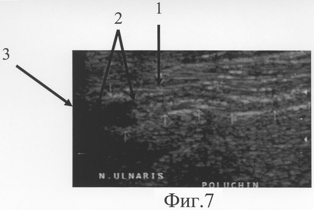 На фиг.5 представлена сонограмма больного Л., 23 лет, с застарелым повреждением локтевого нерва на границе средней и нижней трети правого предплечья.