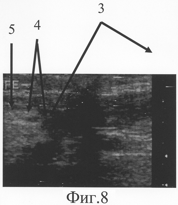 При ультрасонографическом исследовании (фиг.7, 8) установлено, что локтевой нерв поврежден на уровне средней трети правого предплечья. Его проксимальный фрагмент (фиг.7-1) заканчивается невромой (фиг.7-2), линейный размер которой составляет 4 мм. Дистальный фрагмент (фиг.8-5) патологически измененен на протяжении 5 мм. (фиг.8-4). Диастаз между невромой и дистальным фрагментом равен 47 мм (фиг.8-3, фиг.8-3). Размер участка срединного нерва, подлежащего возмещению, составляет сумму линейного размера невромы проксимального фрагмента по линии продольной оси нервного ствола, протяженности диастаза между невромой и дистальным фрагментом, линейного размера патологически изменененного дистального фрагмента и равен 56 мм.