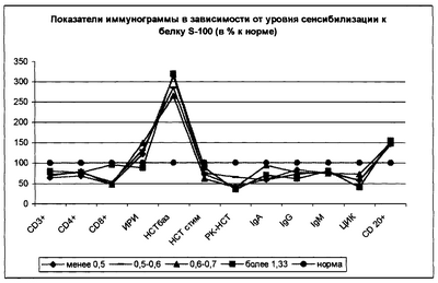Приведенные в табл.1 и на чертеже данные свидетельствуют о том, что в группе больных с высоким уровнем сенсибилизации к белку S-100 показатели клеточного иммунитета значительно снижены по отношению к норме (низкие индексы субпопуляций Т-лимфоцитов, подавлена фагоцитарная активность – НСТ базальный, НСТ стимулированный, РК НСТ-теста. С нарастанием сенсибилизации усиливается выраженность ИДС (снижаются показатели CD 3+, CD 4+, CD 8+, ИРИ, фагоцитарная активность).