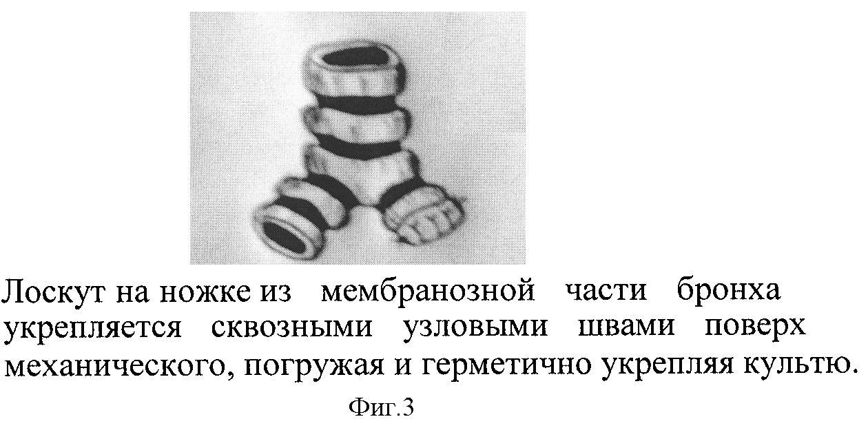Способ герметизации культи бронха достигается следующим образом. После удаления легкого культя главного бронха берется на две лигатуры (фиг.1). Затем механический шов накладывается сшивающим аппаратом, проксимально отступя на 2 см от лигатур, резецируется хрящевая часть бронха по краю сшивающего аппарата, оставляя мембранозную часть в виде лоскута на ножке (фиг.2). Далее обрабатывается 5% раствором йода поверхность механического шва и слизистый слой мембранозной части бронха на ножке. После обработки раствором йода мембранозная часть лоскута прошивается сквозными узловыми швами поверх механического, погружая и герметично укрепляя культю бронха (фиг.3).