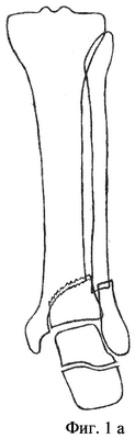 На фиг.1а изображен голеностопный сустав в прямой проекции (вид сзади), чрезсиндесмозный перелом малоберцовой кости в сочетании с переломом переднего края большеберцовой кости.