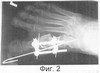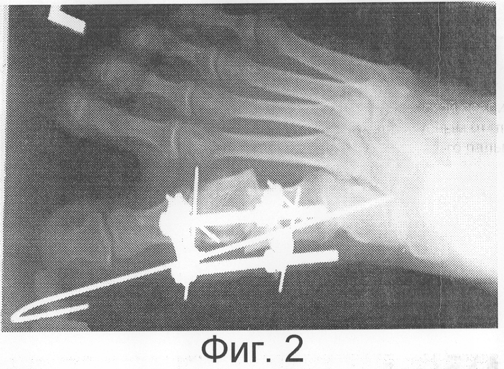 Операционное поле обработано обычным методом. Подкожно по медиальной поверхности 1-го пальца правой стопы до уровня суставной щели 1-го плюснефалангового сустава введена спица Киршнера. Из разреза 3 см в проекции дистальной трети 1-й плюсневой кости с помощью осцилляторной пилы выполнена остеотомия, латерализация 1-го пальца правой стопы, фиксация пальца и проксимального фрагмента 1-й плюсневой кости установленной спицей – клинически деформация устранена. Туалет раны. Рана ушита узловыми швами через все слои. Введены по 2 консольных спицевых фиксатора в проксимальный и дистальный фрагменты 1-й плюсневой кости, которые закреплены во внешних многодырчатых планках, соединенных между собой резьбовыми стяжками. На Фиг.2 представлена рентгенограмма правой стопы в прямой проекции в процессе лечения. На Фиг.3 представлена рентгенограмма правой стопы в боковой проекции в процессе лечения.