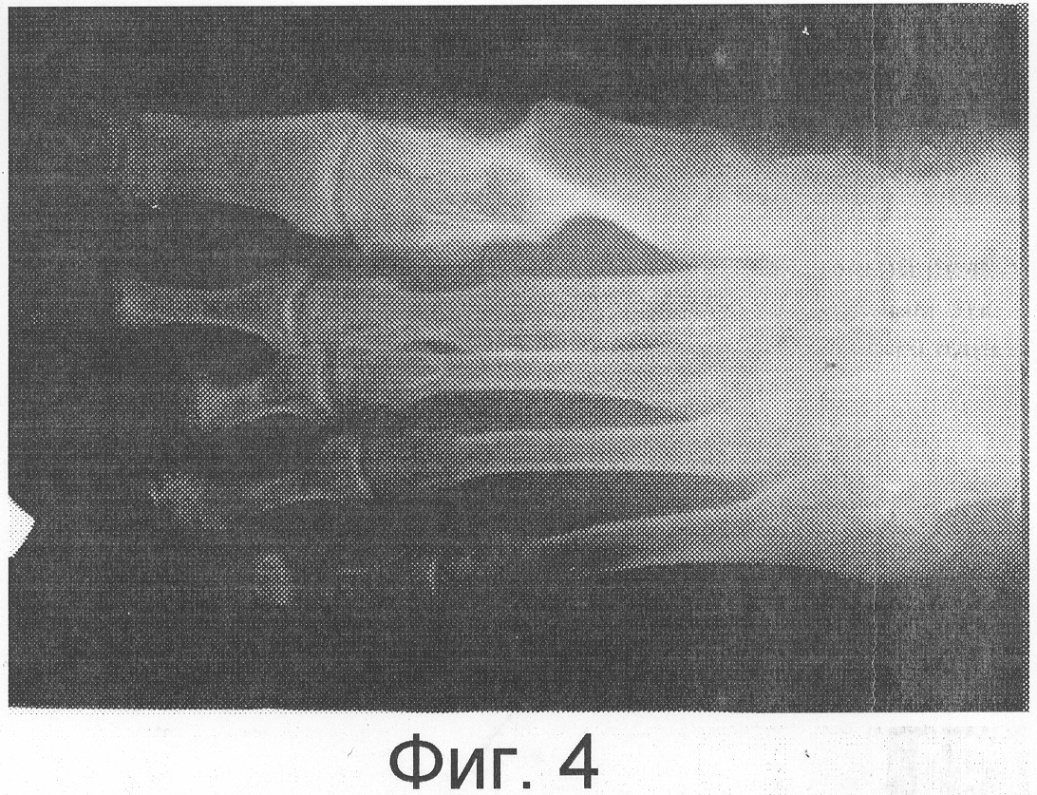 Аппарат демонтирован через 4 недели. Деформация устранена, правильная ось сустава восстановлена, болевой синдром не определяется. На Фиг.4 представлена рентгенограмма правой стопы в прямой проекции после лечения.