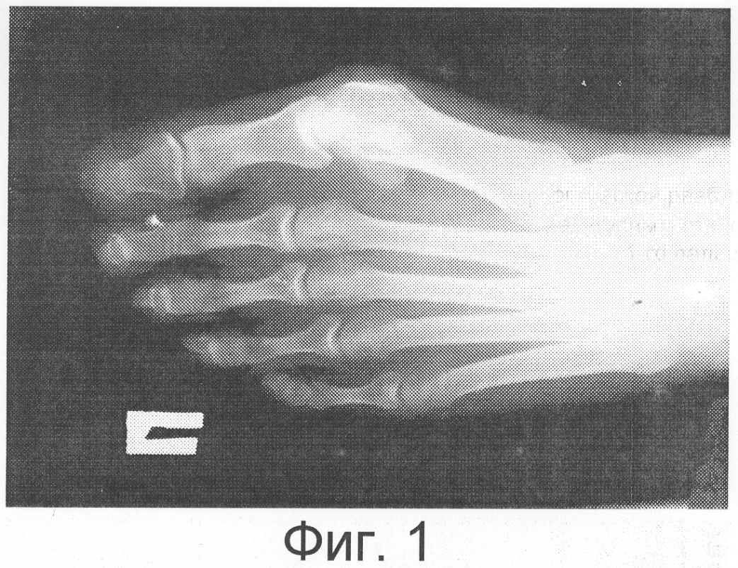 Пример. Больная К., 26 лет. Диагноз «Hallux valgus обеих стоп, более выраженный справа». На Фиг.1 представлена рентгенограмма правой стопы в прямой проекции до операции.
