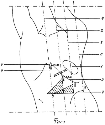 Сущность предложенного способа операционного доступа при лапароскопической спленэктомии заключается в том, что проводят УЗИ-исследование селезенки 1 и топографии ее, а затем наносят на тело больного типичные троакарные точки I-IV, через которые предполагается ввод в брюшную полость оптических (через точки I) и рабочих (через точки II, III, IV) инструментов. Указанные типичные троакарные точки вначале располагают в соответствии с методикой прототипа, т.е. точку I – по среднеключичной линии 2 на 4-5 см ниже левой реберной дуги 3, точку II – по средней линии 4 тела на 3-4 см ниже мечевидного отростка 5, точку III – по левой заднеподмышечной линии 6 между краем левой реберной дуги 3 и крылом подвздошной кости 7, точку IV – в мезогастральной области по левой переднеподмышечной линии 8. На основании УЗИ-исследований и топографии селезенки троакарные точки I и IV смещают вниз или вниз и в сторону средней линии 4 до получения оптимальных условий взаиморасположения инструментов и оптики. Типичные троакарные точки II и III имеют стандартное расположение из-за ограничений, обусловленных строением костного скелета человека. Оптимальные условия взаиморасположения инструментов достигаются только смещением троакарных точек I и IV, причем точку I, через которую вводят первый троакар (телескоп), смещают из типичного положения вниз вдоль среднеключичной линии 2 или вдоль этой линии и вправо к средней линии 4 тела или за нее в зависимости от расположения и размеров селезенки. Троакарную точку IV с рабочим инструментом смещают вниз по левой переднеподмышечной линии 8 или вниз по указанной линии и в сторону средней линии 4 тела. Окончательное положение троакарных точек I и IV должно соответствовать следующим условиям: