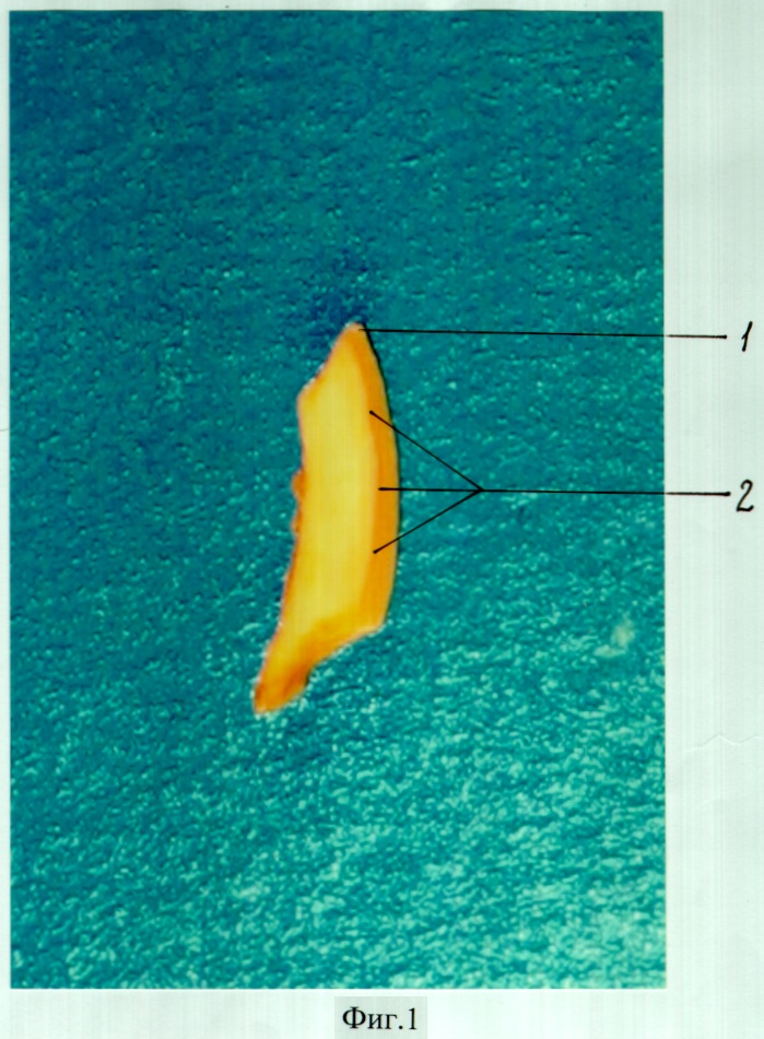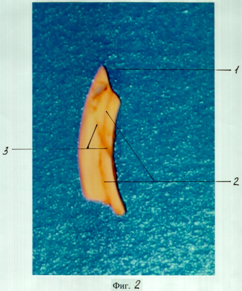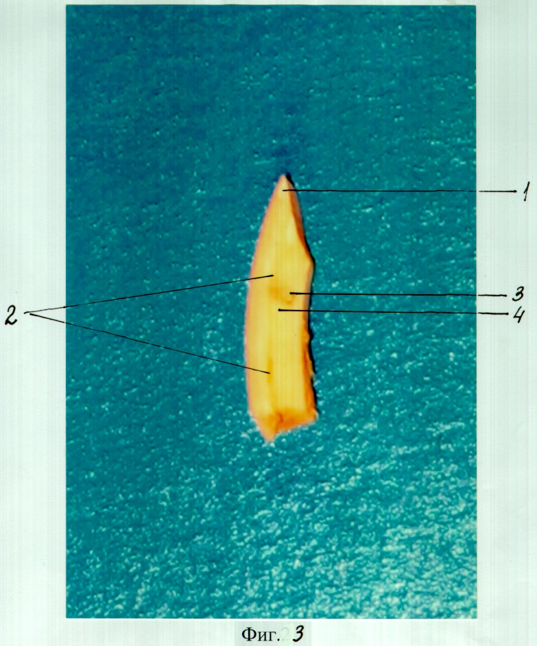 Исследования были проведены на 4-х животных (кролики). У кролика имеется 2 верхних и 2 нижних резца, всего 16 резцов у 4-х животных. Два из 16 резцов (один верхний и один нижний) у одного из 4-х кроликов были оставлены неповрежденными (контроль 1) (на фиг.1 изображен шлиф интактного резца кролика. Корневой канал обозначен цифрой «2»). В 14 остальных верхних и нижних резцах в пришеечной области зуба с помощью бормашины были сформированы перфорационные отверстия, сообщающиеся с корневыми каналами, т.е. смоделирована механическая травма пульпы зуба (на фиг.2 в плоскости шлифа видна часть перфорационного отверстия через твердые ткани коронки зуба).