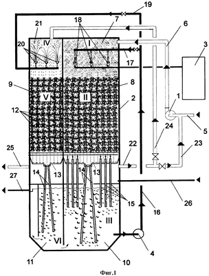2. Устройство для осуществления способа по п.1, содержащее установку, разделенную на зоны очистки с перепускными трубами и трубами для подачи потоков жидкости и газа, вентилятор высокого давления, насос, отличающееся тем, что установка состоит из шести камер, в камере орошения первой ступени установлены акустические ультразвуковые диспергаторы, а в камере орошения четвертой ступени установлены отражательные зонты, насадочные камеры второй и пятой ступени заполнены шаровидными элементами, в барботажной камере третьей ступеней установлены трубы прямой подачи и аэрационные колонны, а в барботажной камере шестой ступени установлены аэрационные колонны.