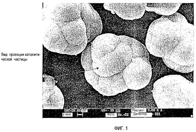 7. Катализатор по п.6, где многодольчатые частицы имеют площадь поверхности, которая, по меньшей мере, 1,05-кратна, предпочтительно, по меньшей мере, 1,1-кратна площади поверхности так называемого эквивалентного круга, где эквивалентный круг определяется как круг с наибольшей длиной окружности, который точно вписывается в контур частицы, полученный при проектировании частицы на плоскость при ориентации, позволяющей представить максимально возможную наружную площадь поверхности в пределах видимости.