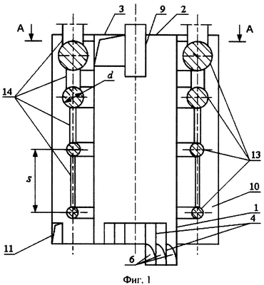 Объемная доля частиц твердой фазы, образовавших флотокомплексы с пузырьками газа, выделившегося из суспензии, изменяется в направлении оси гидроциклона согласно известным закономерностям, зависящим от конструктивных и режимных параметров гидроциклона, согласно которым градиент объемной доли частиц твердой фазы, связанных в комплексы, возрастает в осевом направлении по мере уменьшения расстояния от патрубка 3 подачи суспензии в корпус гидроциклона. Следовательно, разделительная способность гидроциклона может быть повышена путем распределения объемной доли пузырьков вторичного газа, поступившего через пористую стенку корпуса 1, пропорционально объемной доле частиц твердой фазы, связанных в комплексы в суспензии, в результате чего согласно кинетическому уравнению процесса флотации возрастет объемная доля частиц твердой фазы, извлекаемых из суспензии пузырьками вторичного газа. Принимая во внимание, что в осевой зоне верхней части корпуса 1 гидроциклона поддерживается разрежение, а центробежное давление в пленке суспензии на стенке падает по мере увеличения расстояния от патрубка 3 подачи суспензии в корпус гидроциклона в связи с затуханием окружной составляющей скорости в осевом направлении, изменением давления в пленке суспензии на стенке можно пренебречь, полагая, что распределение объемной доли пузырьков газа, поступивших в гидроциклон через пористую стенку корпуса 1, пропорционально распределению давления газа в коллекторе 10 в осевом направлении. Следовательно, необходимое распределение объемной доли пузырьков вторичного газа может быть достигнуто путем изменения распределения давления газа в коллекторе 10 в осевом направлении. Для этого в коллекторе 10 установлено устройство для распределения давления газа, выполненное в виде кольцевых элементов 13, установленных коаксиально корпусу 1 гидроциклона с возможностью независимого перемещения в осевом направлении, имеющих форму круга в сечении, проходящем через ось корпуса гидроциклона. Диаметр сечения кольцевых элементов d возрастает, а расстояние между соседними кольцевыми элементами s уменьшается по мере уменьшения расстояния от патрубка 3 подачи суспензии в корпус гидроциклона. Кольцевые элементы 13 закреплены на телескопических тягах 14, представляющих собой набор пустотелых цилиндров, 4 жестко соединенных с соответствующими кольцевыми элементами 13.