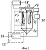 В корпусе блока фильтров установлен датчик 21 температуры, в бункере для сбора пыли – аварийный датчик уровня пыли 22, в выходном коробе – тепловой автоматический датчик-извещатель 23, выходы которых соединены с общим микропроцессором 24, размещенным в шкафу управления 25 (фиг.2), а в выходном коробе установлен коллектор 26 с форсунками 27 для подключения к системе пожаротушения, блок управления 28 которой соединен с общим микропроцессором 24, а система регенерации 29 рукавных фильтров содержит блок управления 30, который связан электронной связью с общим микропроцессором 24.