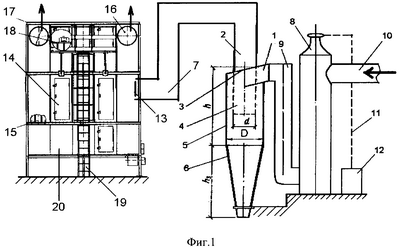 Запыленный газовый поток подается через патрубок 10 в акустическую колонку 8, параметры звуковых колебаний которой настраиваются от блока управления 12. В звуковой колонке 8 происходит отделение от воздуха пылевых частиц, так как под действием звукового поля и связанных с ним колебательных процессов, происходящих в воздушной среде, пылевые частицы коагулируются, а крупные частицы оседают вниз колонны, откуда воздушный поток поступает на вторичную очистку в циклоне через воздуховод 9 на ввод 1. Здесь он закручивается за счет тангенциального периферийного ввода и винтообразной крышки 3. Затем направляется по нисходящей винтовой линии вдоль стенок аппарата. В результате чего частицы пыли под действием центробежной силы движутся от центра аппарата к периферии и, достигая стенок аппарата, транспортируются вниз в коническую часть 6 корпуса для сбора уловленной пыли. Предварительно очищенный воздух выводится из циклона через выходной патрубок 4. При этом легкие, мелкодисперсные фракции частиц пыли, не уловленные в конической части корпуса, задерживаются на тонком фильтре 17, связанном с ним воздуховодами 2 и 7.