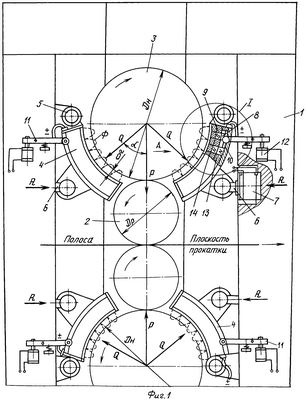 Способ прокатки осуществляется следующим образом. Магнитные блоки при помощи устройств 12 (например, гидроцилиндры) и рычагов 11, соединенных с реечным устройством 10, устанавливаются в положение “выключено”, при котором на поверхности магнитных плит 4 потоки Ф отсутствуют. С помощью гидроцилиндров 7 магнитные плиты 4 поворачиваются вокруг шарниров 5 и между валками 3 и плитами 4 устанавливается начальный зазор “ “. После установки зазора магнитные блоки устанавливаются в положение “включено”, при этом на поверхности плит возникают магнитные потоки Ф, пронизывающие воздушные зазоры “ ” и поверхность валков 3, не распространяясь вглубь валка 3 и не пересекая рабочие валки 2, что намного сокращает их путь.
