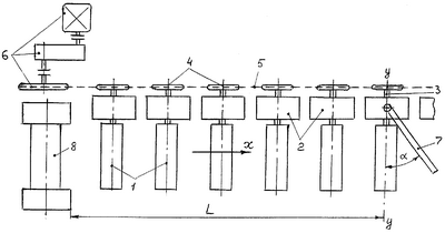 Каждый цилиндрический ролик 1 рольганга установлен консольно в горизонтальной опоре-секции 2, причем на конце его оси 3, проходящей через опору, расположена звездочка 4 для цепи 5 привода 6. Между роликами 2 расположен отбойник 7, местоположение которого относительно последней клети 8 стана может изменяться (т.е. изменяется величина L). Кроме того, может изменяться (в пределах 45°…75°) величина угла между отбойником и осью уу рольганга.