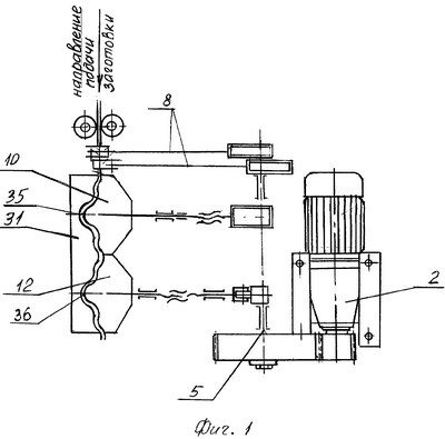 На верхней плите 6 со стороны, противоположной приводу 2, установлена матрица 32, представляющая собой пластину с конфигурацией рабочей поверхности, выполненной в зависимости от требуемого профиля заготовки и состоящая из двух секций – предварительной гибки 33 и калибрующе-фиксирующей 34 (фиг.3). В зоне предварительной гибки 33 матрицы 32 посредине толщины выполнен паз, в котором закреплены с возможностью свободного вращения деформирующие ролики 35 (фиг.8).