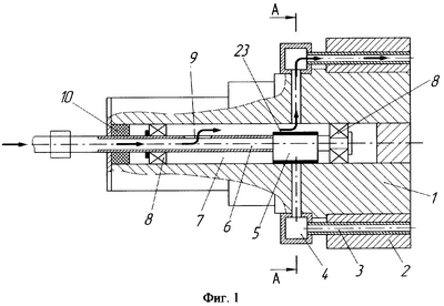 Отличительным признаком является то, что в осевом отверстии для подачи охладителя установлен на оправке эксцентрик с уплотнением на его поверхности.