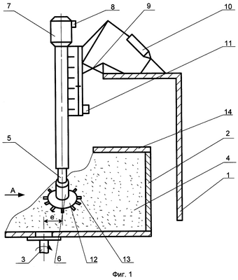 На фиг.1, 2, 3, 4 показано предлагаемое устройство. Устройство включает корпус 1, ротор 2, вал 3, свободный абразив 4, дополнительный вал 5, оправку 6, тормозное устройство 7 с задатчиком частоты вращения 8, привод 10 наклона вала 5, привод 11 поворота вала 5, диск 12 с размещенным на нем множеством деталей 13 (например, турбинных лопаток), крышку 14 ротора 2. На фиг.2, 3, 4 показаны возможные положения диска 12 с деталями 13.
